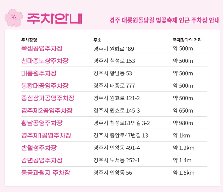경주는 벚꽃 시즌 동안 교통 체증이 심하므로 기차나 버스를 이용한 후 택시나 셔틀버스를 이용하는 것도 좋은 방법입니다.